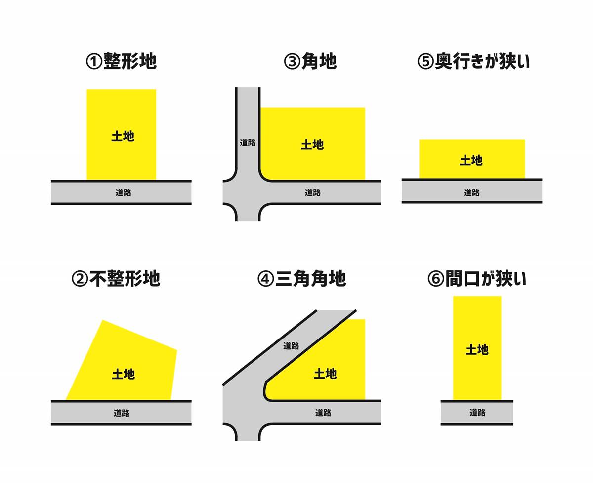 三角形や旗竿地のような形状の悪い土地は設計の自由度が制限されることもあります。