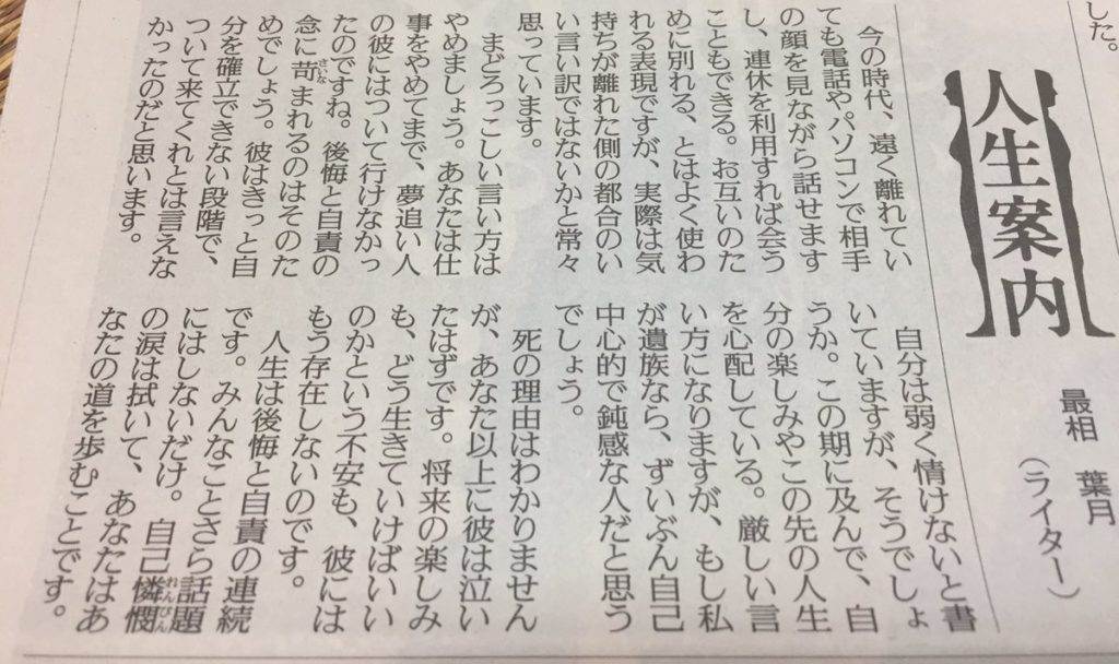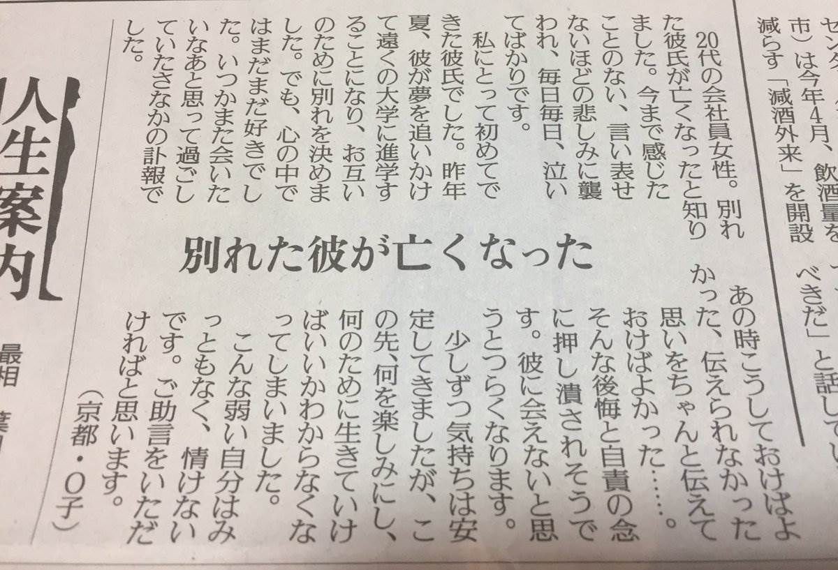 ある日、晴れた空を仰ぎながら、一人の女性が新聞の人生相談コーナーにペンを走らせていました。彼女の心は、まるで嵐のように乱れています。彼女は、数ヶ月前に別れた元カレの訃報を聞いたばかりで、その悲しみに押しつぶされそうになっていました。