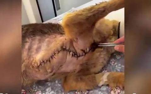 手術後、犬の精神状態は非常に良好で、体全体がリラックスしているようでした。ボランティアたちはご褒美として大きなローストチキンを与えました。犬は食欲を取り戻し、元気に食事を楽しみました。医師たちは術後の感染症を予防するために、毎日傷口の消毒と抗炎症剤の投与を続けました。