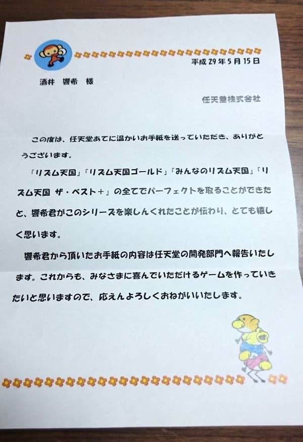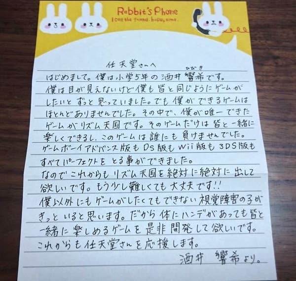 響希くんが唯一楽しめるゲームが、任天堂の「リズム天国」でした。彼はこのゲームをパーフェクトにクリアし、その感謝の気持ちを手紙にして任天堂に送りました。