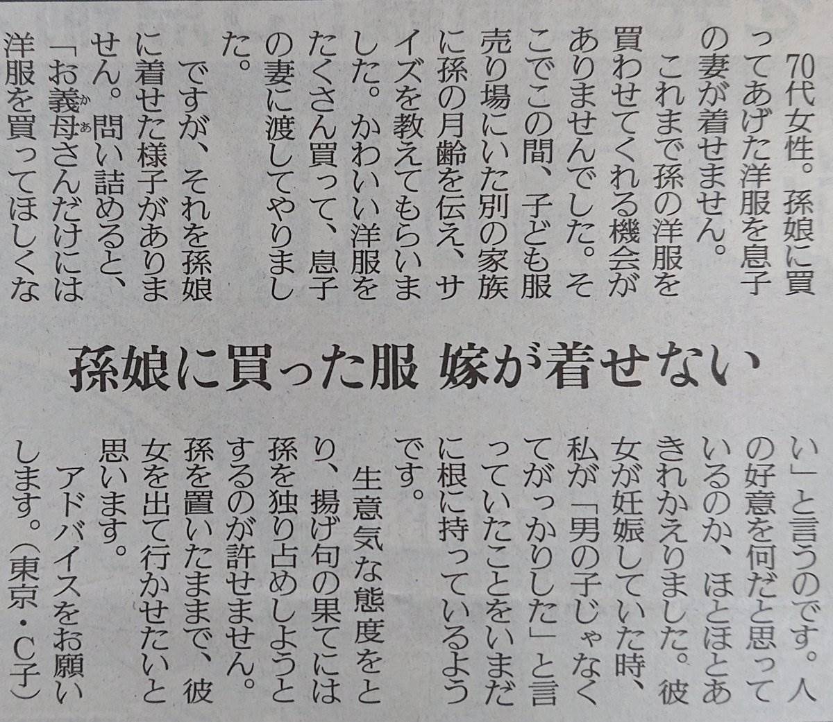 以下が、ある新聞の質問コーナーに寄せられた姑に関する問題と、それに対するTwitter上の反応です。