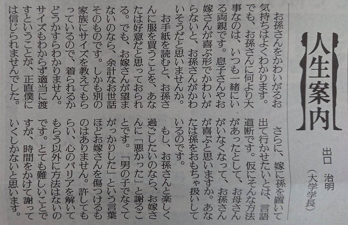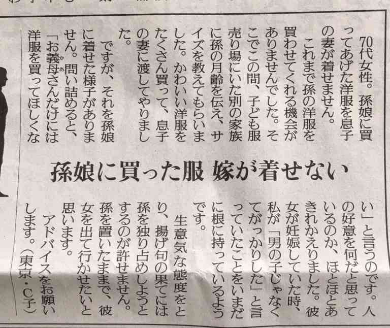 ある新聞の質問コーナーには、一人の女性が姑からの嫌がらせについて相談しています。姑は嫁が妊娠中の女の子について「男の子じゃなくてがっかりした」と発言し、さらには孫を独り占めしたいと思っているようです。