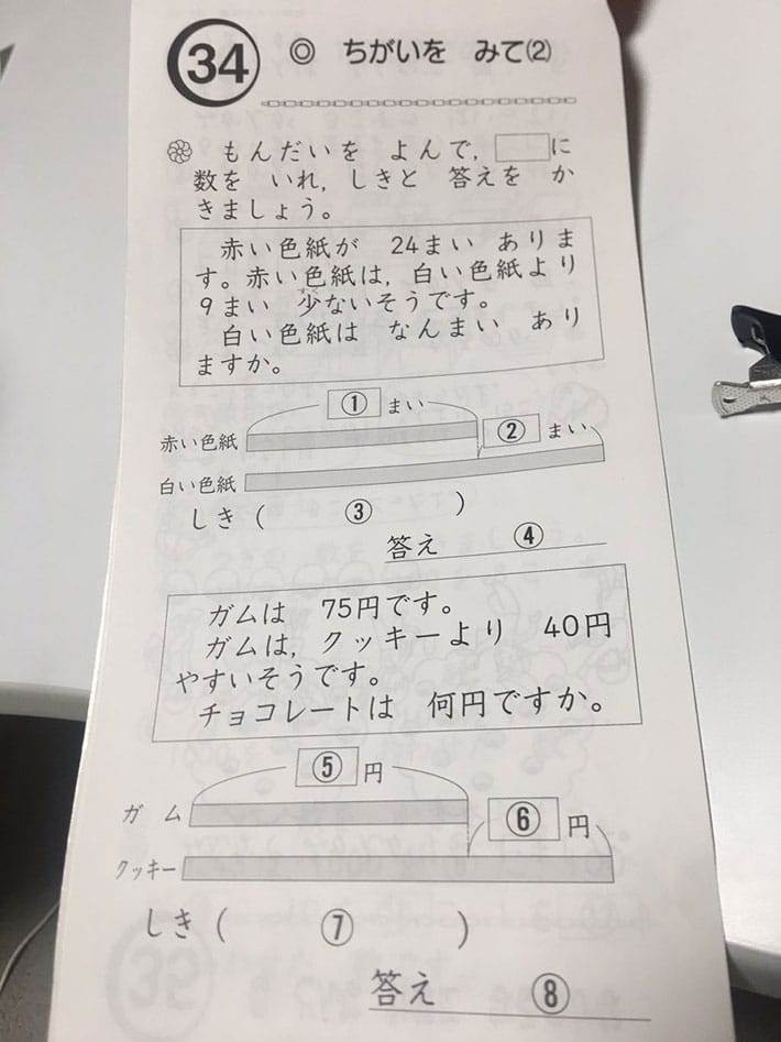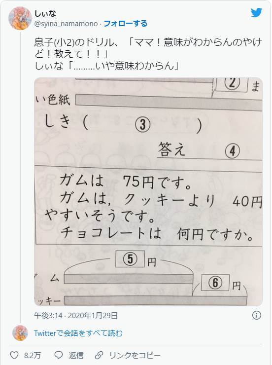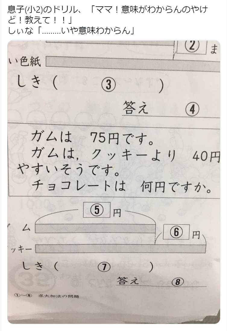 「ガムは75円です。ガムはクッキーより40円安いです。チョコレートは何円ですか?」という問題が載っているが、よく読むとチョコレートの価格に関する手掛かりはどこにもない。息子は当然混乱してしまい、助けを求めてきたのだ。