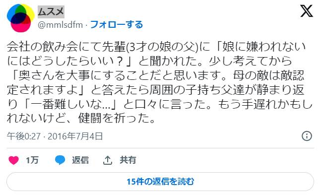 妻から電話が入る。4歳の娘が『パパと遊びたい』とワガママ言って泣いているので、なだめてほしいとのこと。 気持ちは嬉しいが、電話口で『パパお仕事中だから待っててね』と言ったら、娘は更に大声で泣きながら『お仕事なんて、やる気ある人に任せたらいいでしょ!』だって。 致命傷。