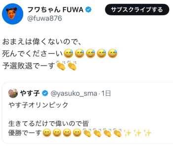 すべての始まりは、お笑い芸人のやす子が投稿した「オリンピック、生きてるだけで偉いので皆優勝です」というメッセージに対し、ふわちゃんが「お前は偉くないので死んでください、予選敗退です」と返信したことでした。このコメントはすぐに削除されましたが、スクリーンショットがネット上に広まり、問題は一気に拡大しました。