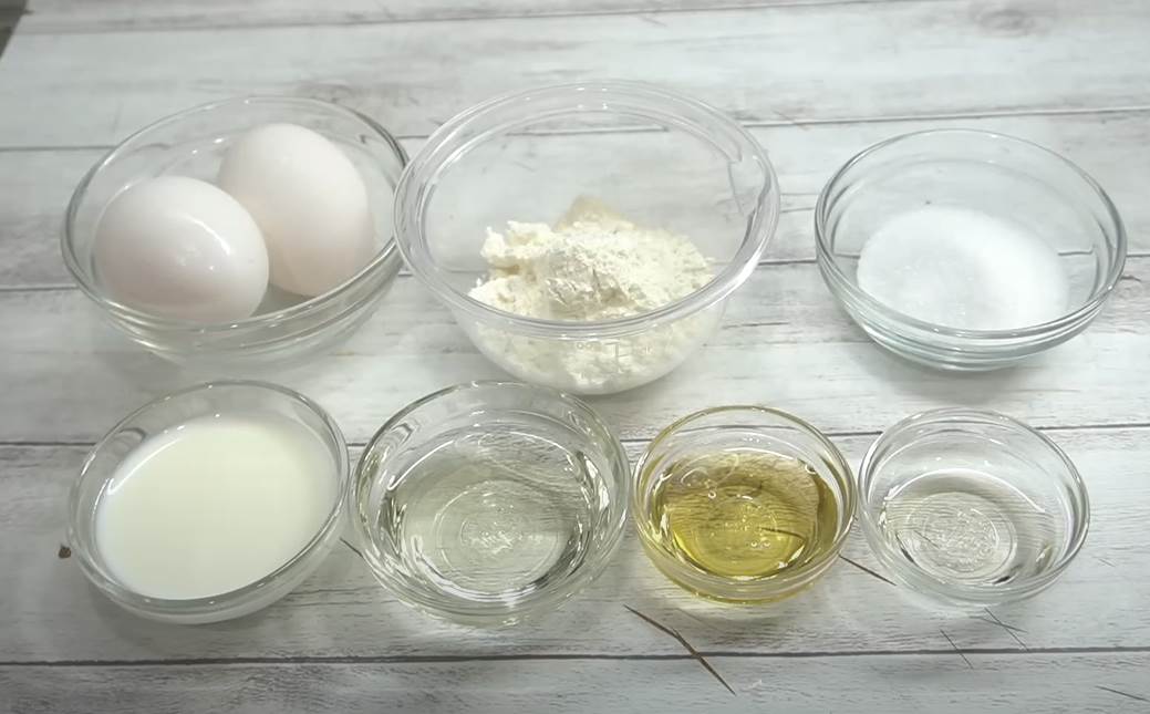 卵(Lサイズ)、薄力粉、グラニュー糖、牛乳、サラダ油、はちみつ、みりん(少量で風味をプラス)。