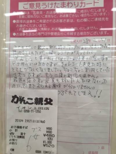 イオン上田店のフードコートにある店舗で、客の中傷とも取れる落書きがされたレシートが話題となりました。女性客が注文した品と一緒に渡されたレシートに「ブス女」と書かれていたことが判明し、この出来事に対して激しい怒りが寄せられました。女性客は意見カードに投稿し、この出来事によって非常に傷ついたと述べています。