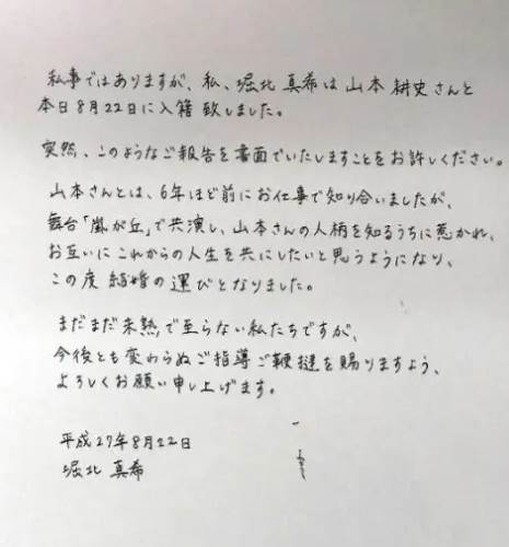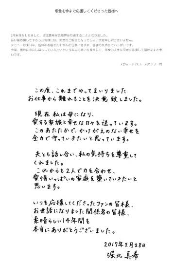 堀北真希さんは2015年8月に、交際期間2ヶ月で山本耕史さんとスピード結婚し、2016末までに第1子を出産、2017年2月をもって所属事務所『スウィートパワー』を退所すると共に、事実上の芸能界引退となりました。