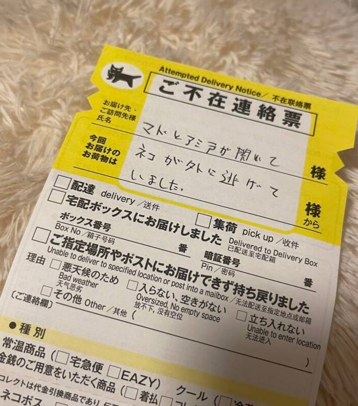 帰ってきたらヤマトの不在票入ってて なんか届くものあったかな?って思ってみたら入っててめちゃくちゃ焦ったんだが!? 自分で開けやがった、、、 ほんとにびっくりした、心臓飛び出る、、、、そこに書かれていた驚きのメモが・・・