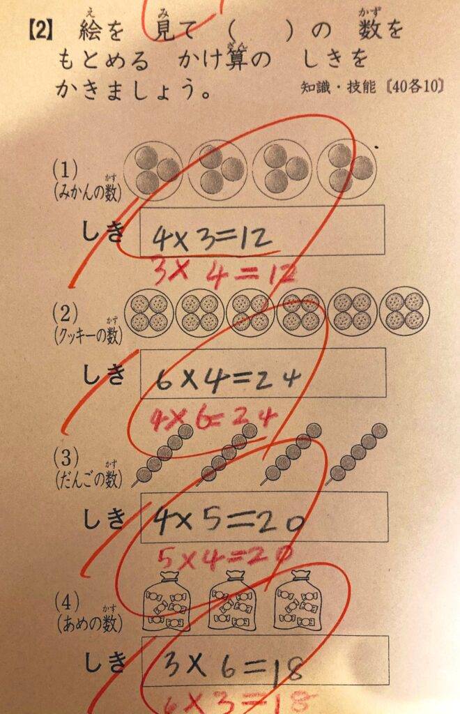 算数のテスト、問題は絵を元にかけ算の式を立てて答えを導き出すというもの。