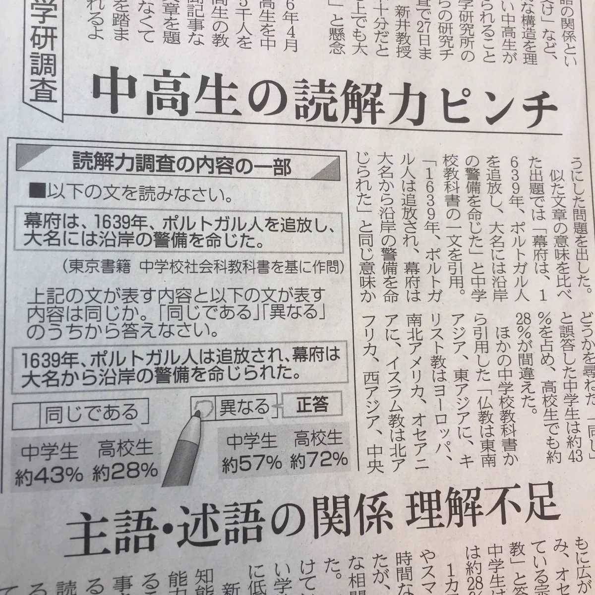 中学生と高校生の読解力を調査するための問題について話題です。中学生の43%がこの問題を間違えたとのことで、主語・述語の関係が理解できていないと指摘されています。この結果に驚きつつも、子供たちが本を読む機会が減っていることや、コミュニケーション手段の変化によって、考えを整理して話す機会が少なくなっていることが原因だとも考えられます。また、高校生でも28%がこの問題を間違えていることも指摘されています。