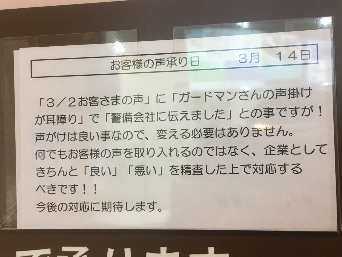 「ガードマンさんの声掛けが耳障りで『警備会社に伝えました』との事ですが、声がけは良い事なので、変える必要はありません。何でもお客様の声を取り入れるのではなく、企業としてきちんと『良い』『悪い』を精査した上で対応するべきです!!今後の対応に期待します。」