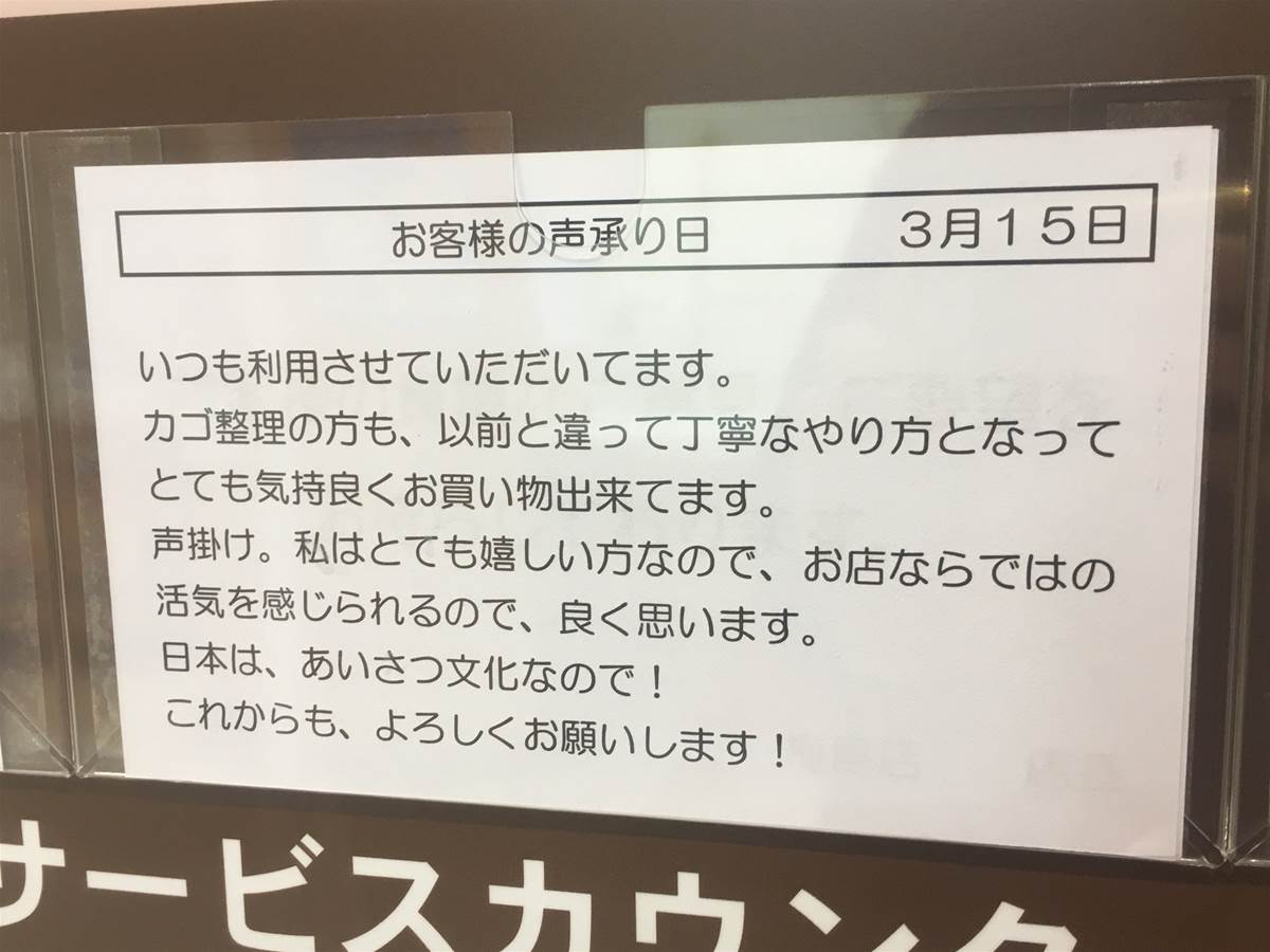 「いつも利用させていただいてます。カゴ整理の方も、以前と違って丁寧なやり方となってとても気持良くお買い物出来てます。声掛け。私はとても嬉しい方なので、お店ならではの活気を感じられるので、良く思います。日本は、あいさつ文化なので!これからも、よろしくお願いします!」