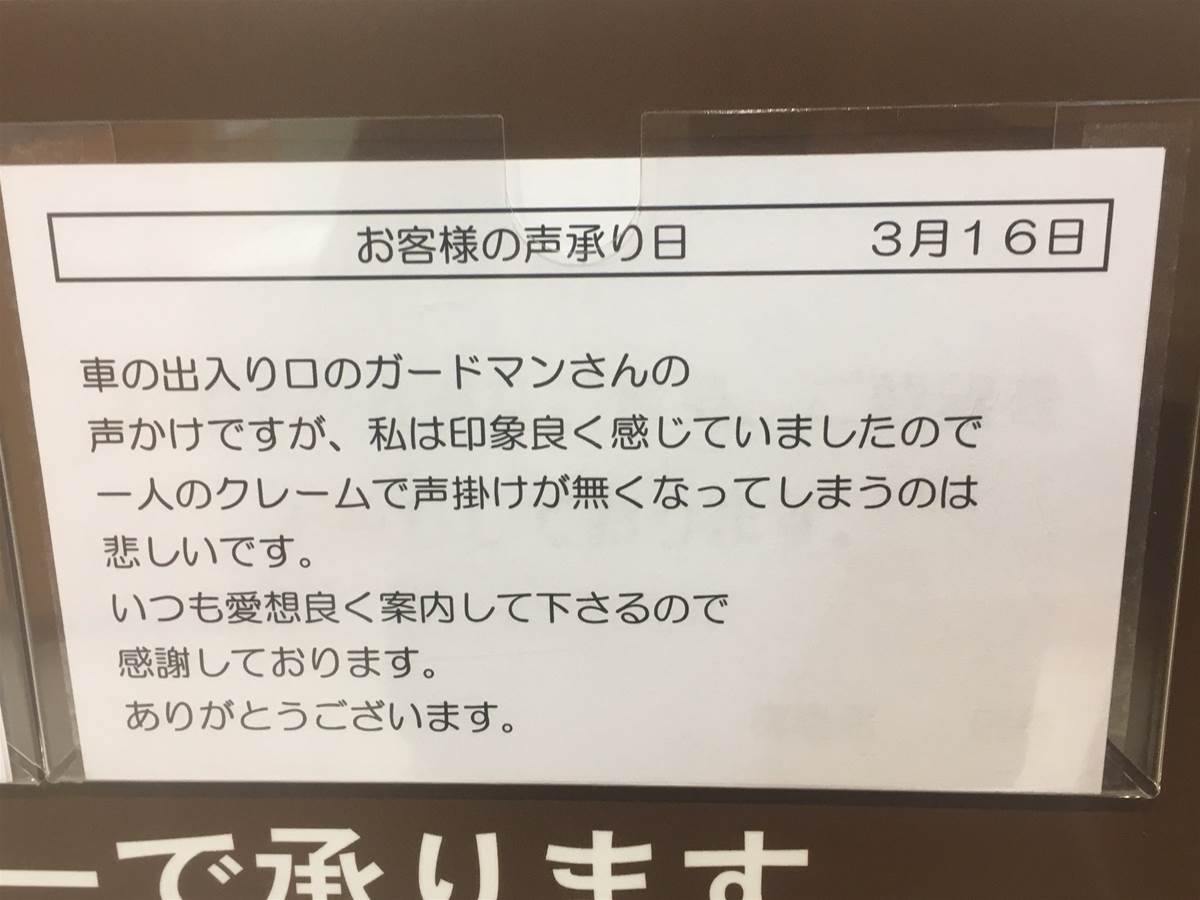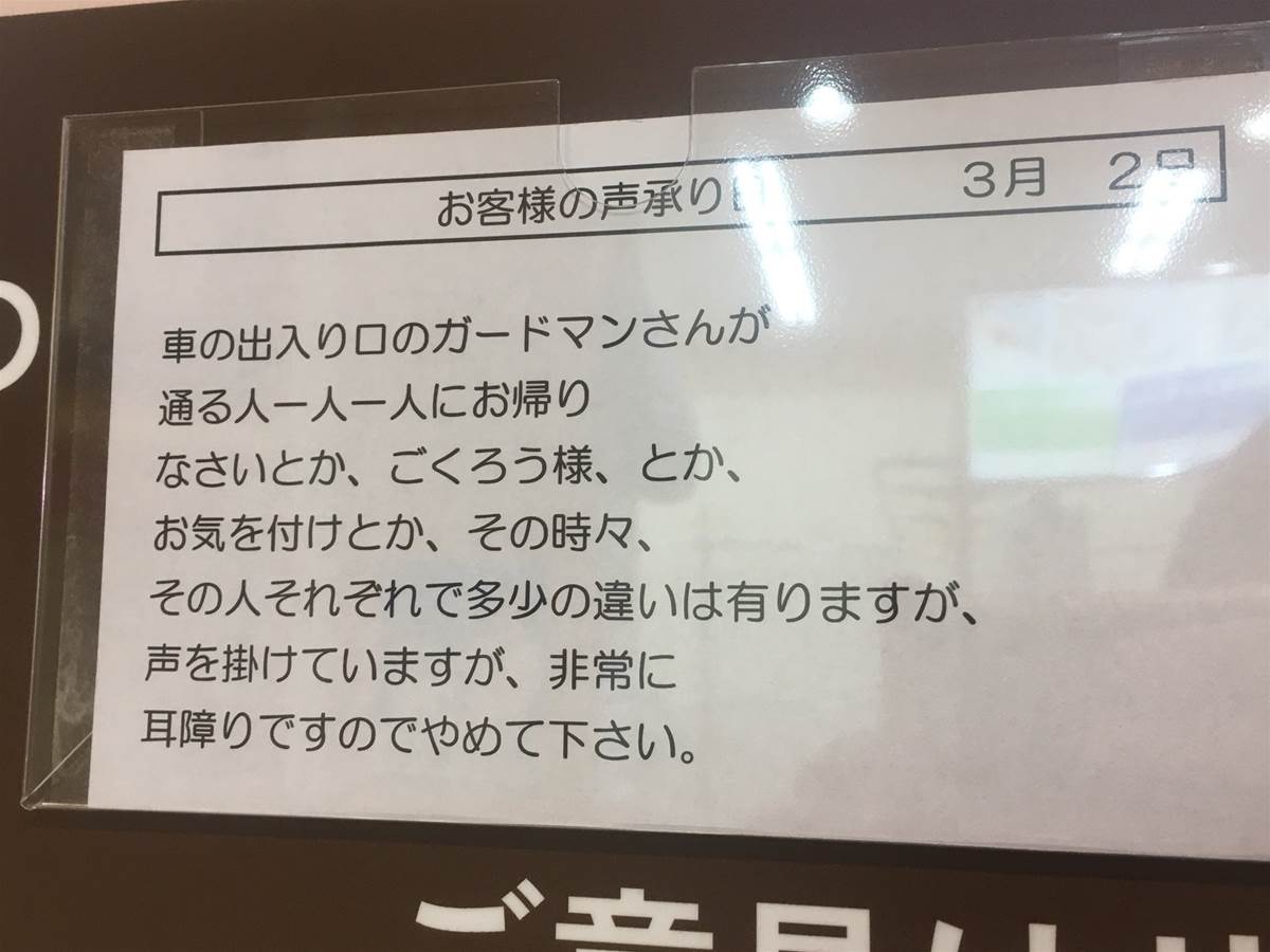 「ガードマンさんの声かけですが、私は印象良く感じていましたので、一人のクレームで声掛けが無くなってしまうのは悲しいです。いつも愛想良く案内して下さるので感謝しております。ありがとうございます。」