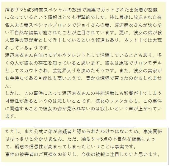 最近、特定のテレビ番組で起きた編集の問題が大きな話題となっています。10月10日に放送された「踊るサマ5点3時間スペシャル」において、一部の出演者が放送からカットされたのです。この中で最も注目を集めたのは、タレントのジョイさんの妻であり、モデルとしても活動する渡辺麻衣さんでした。彼女が画面に映らなかったのは、彼女の弟が殺人事件の容疑者として名が挙がっていることが背景にあると推測されています。この不自然な編集は、渡辺さんとその家族に関する様々な疑問を呼び起こしましたが、事件の詳細についてはまだ公表されていません。
