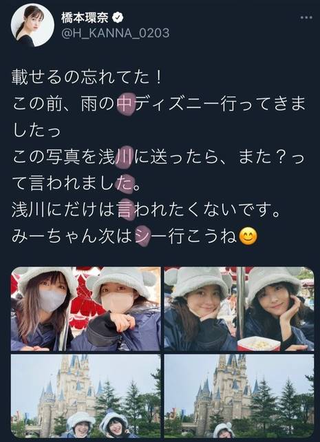 報道前日のツイートでは橋本さんが浜辺美波さんとディズニーランドを訪れたことを写真付きで綴っています。