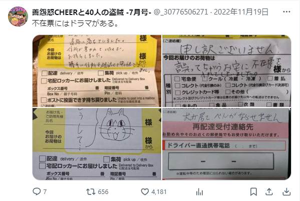 この出来事は、配達員個人の優しさや配慮が際立つ瞬間を捉えている。通常の配達サービスを超えて、彼らの行動が多くの人々に感動を与え、クロネコヤマト及びその配達員に対して、深い感謝の気持ちを表しているのである。