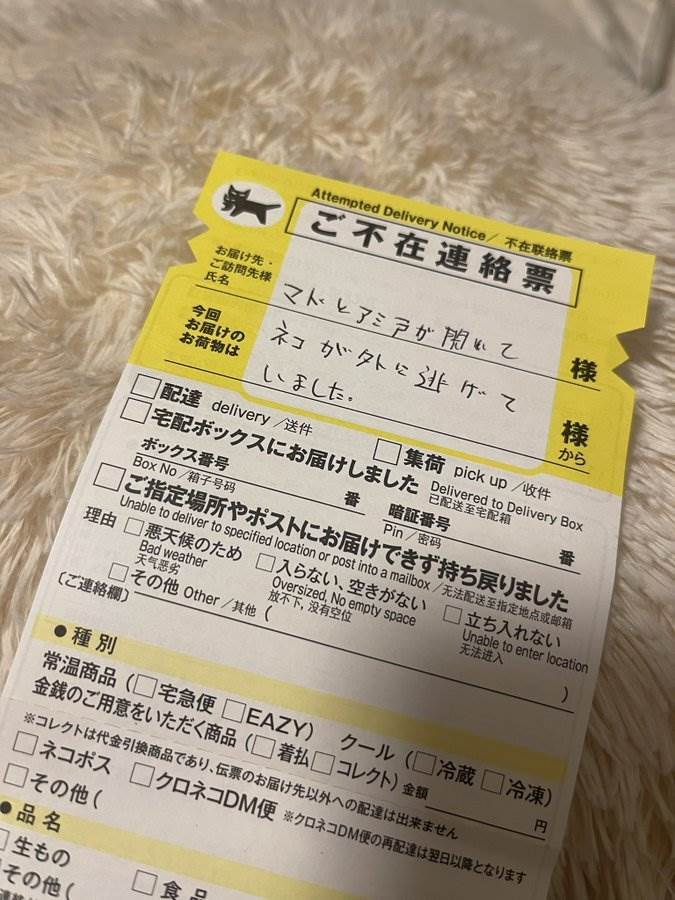 長い一日の仕事を終えて、やっと家に帰り着いた私。ドアの下に一枚の黄色い紙が挟まれているのが目に入った。それは、ヤマト運輸の不在通知だった。しかし、注文した記憶がない。どんな荷物が届いているのだろう?興味津々で通知を手に取ると、驚きとともに心臓が飛び出しそうになった。