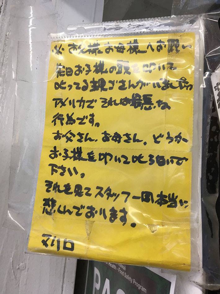 先日お子様の頭を叩いて叱ってる親ごさんがいました。アメリカでそれは最悪な行為です。お父さん、お母さん、どうかお子様を叩いて叱らないでください。それを見てスタッフ一同本当に悲しんでおります。