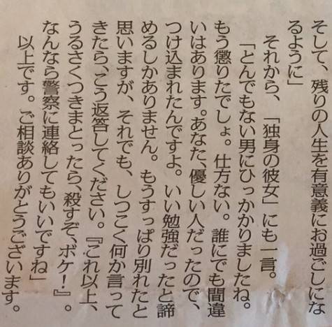奥様に続き、次は交際相手の独身女性に対し「とんでもない男にひっかかりましたね。誰にでも間違いはあります。なんなら警察に連絡してもいいですね」と終始言いたい放題。