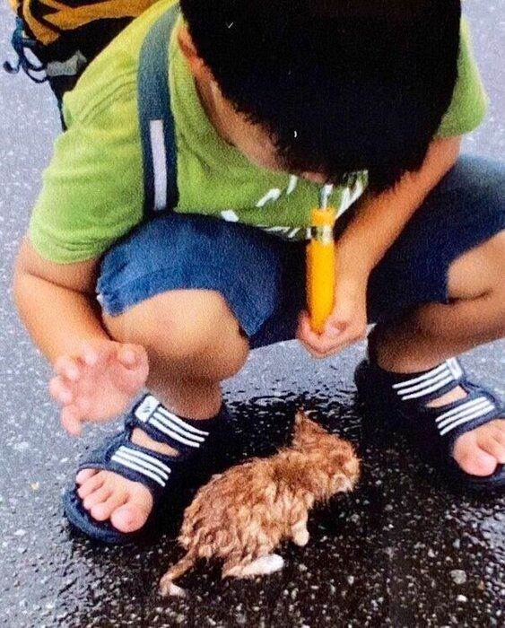 2011年9月1日、この日は台風の影響で雨が降っていたそう。飼い主さんは息子さんと一緒に土手を歩いていたそうですが、息子さんが突然「ママー! 猫ちゃん!」と叫んだのだそうです。その声を聞いて振り向くと、息子さんの足元に雨でずぶ濡れになった小さな子猫がいたのでした。 飼い主さん: 「どこから現れたのかまったくわからなくて、もちろん近くに親猫がいる様子もなく、小さく震える子猫に戸惑いました。