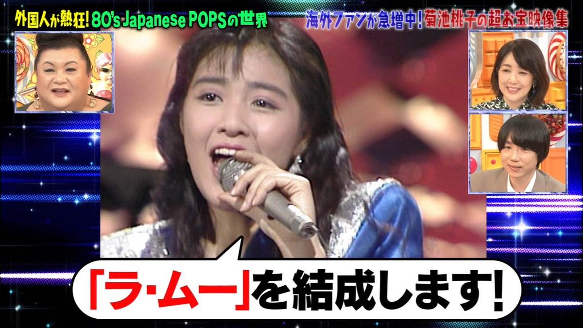 ここで番組では、菊池の来歴を紹介し、84年のデビュー曲『青春のいじわる』のジャケットや『ザ・ベストテン』の出演時の映像も流れ、1988年にラ・ムーを結成したことも伝え、当時の映像も公開しました。マツコ・デラックスは「衝撃的だったね…」とつぶやいています。