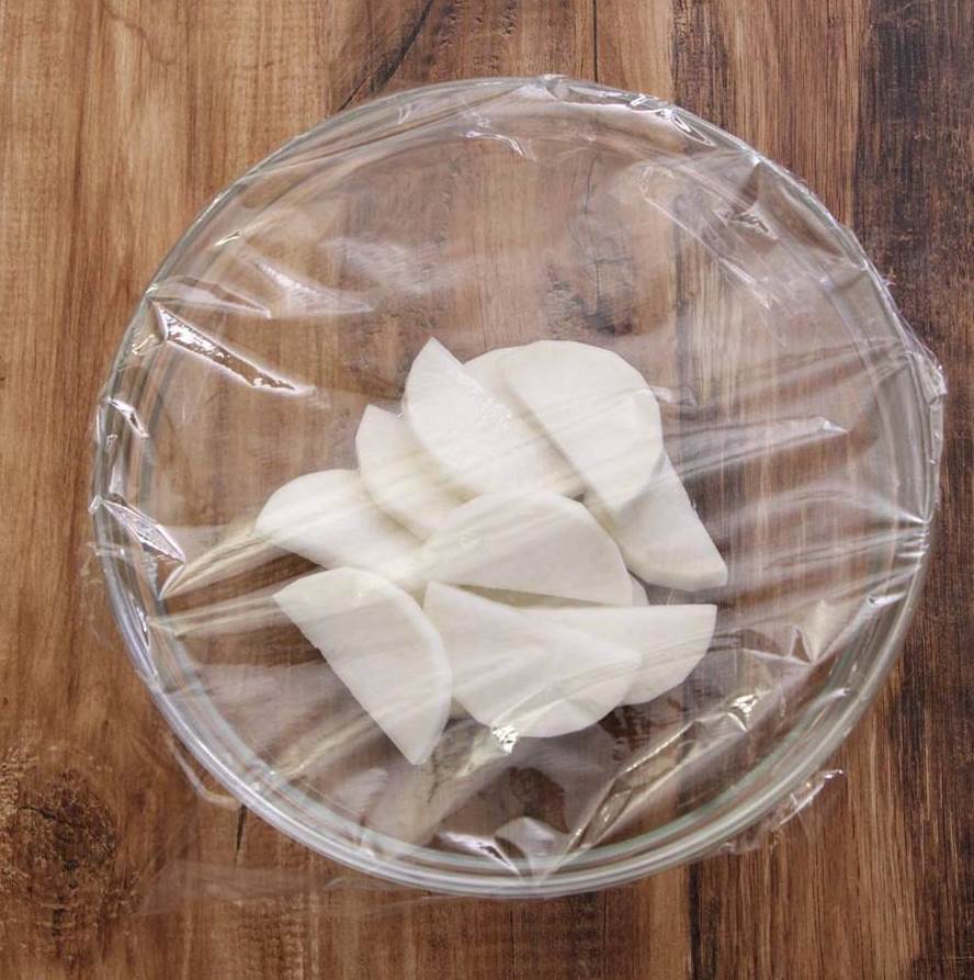 酒(大さじ1)を加えてふんわりとラップをし、600Wの電子レンジで5分間加熱します。こうすることで、大根がしっかりと柔らかくなります。