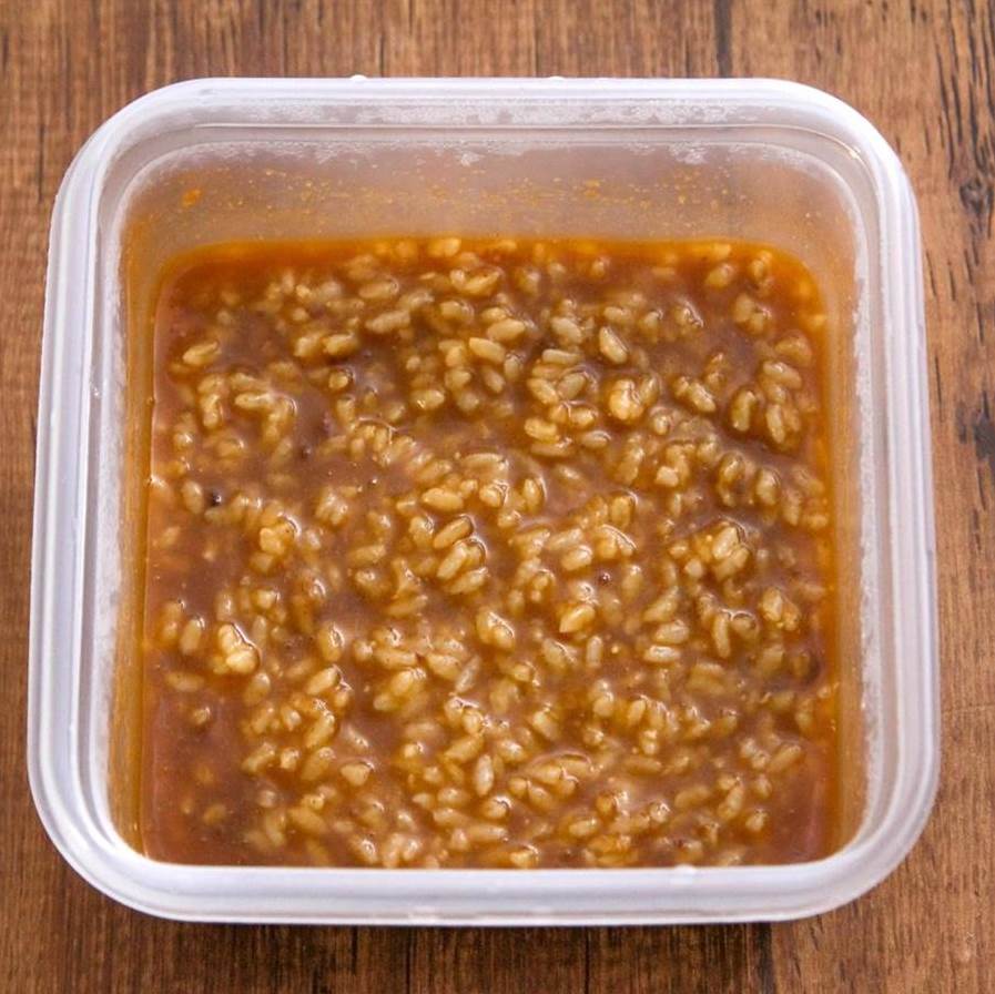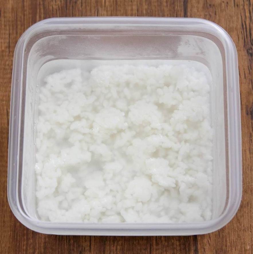 ① 冷凍ご飯150g と 水250ml を耐熱容器に入れ、 電子レンジで3分加熱 します。② ご飯が温まったら、よく混ぜてください。